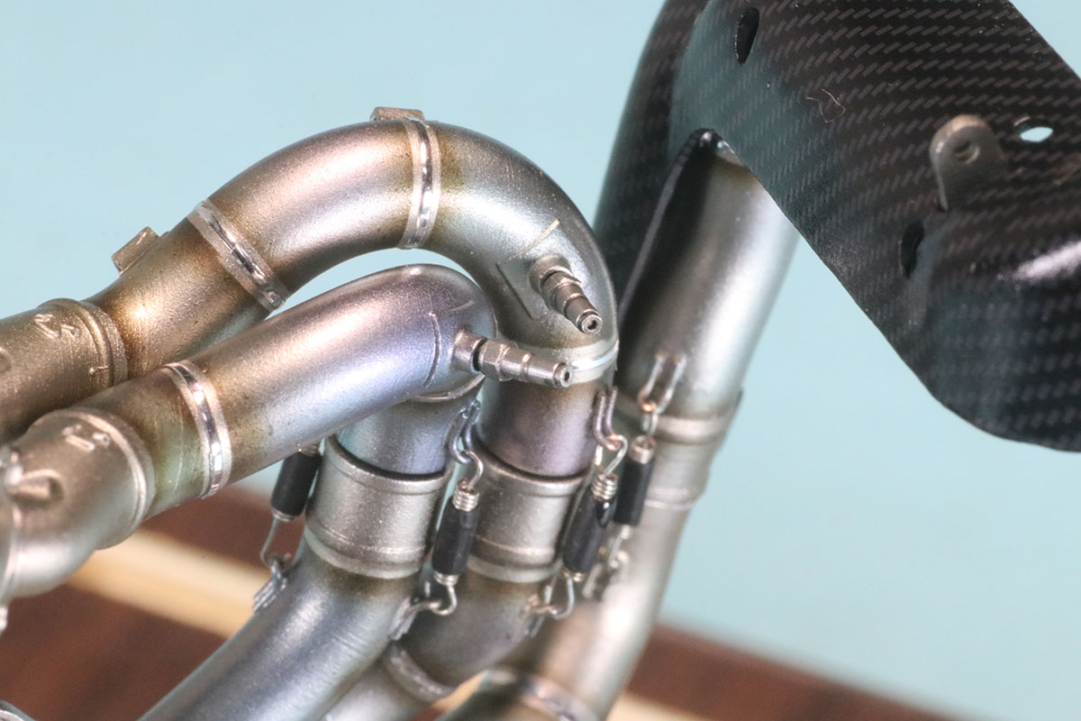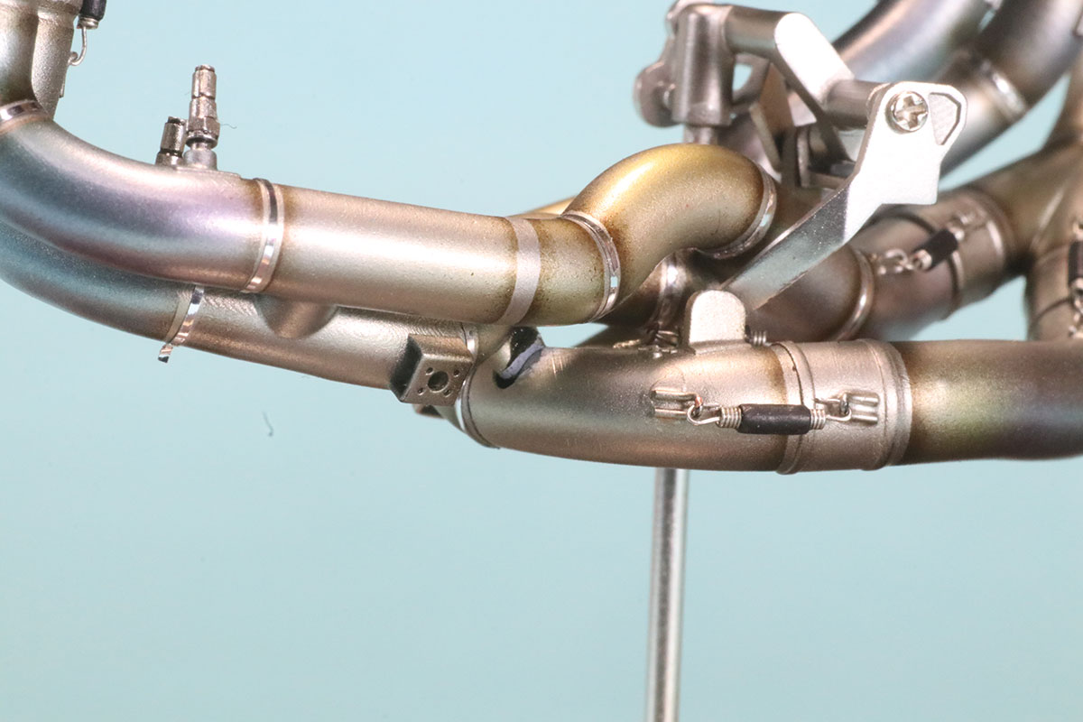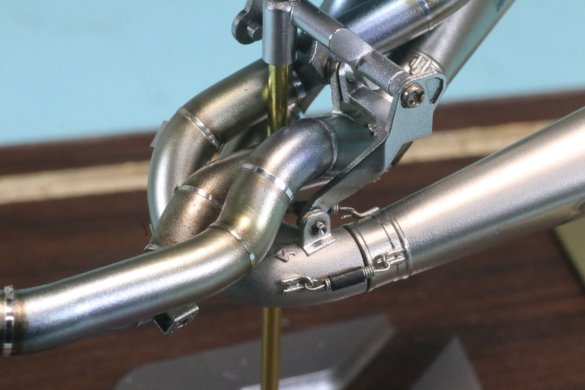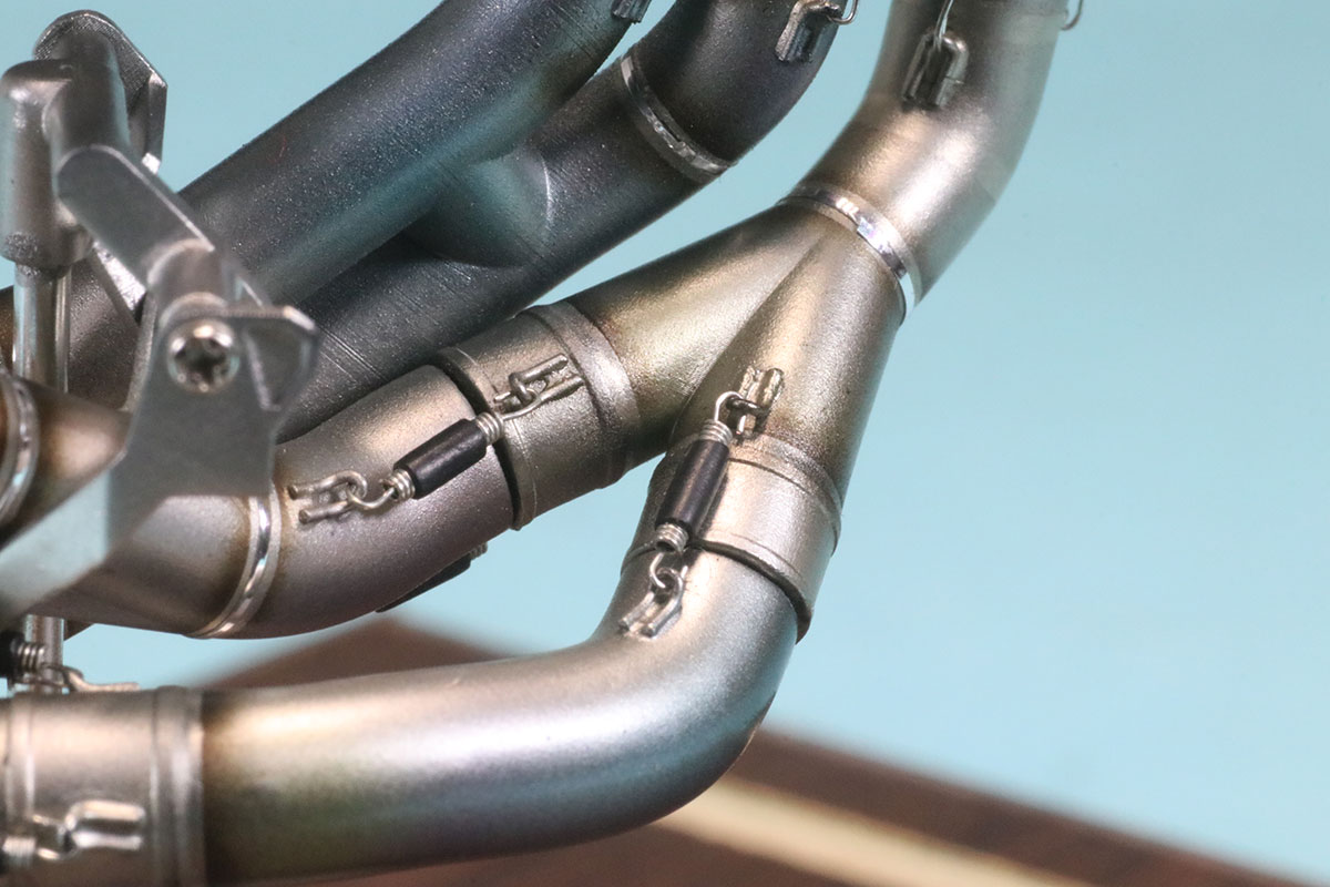 を実際に組み上げたサンプルを見せてもらうことができましたので詳細画像を撮影させていただきました。(画像のなかでマフラースプリングとスプリイングフックが写っていますが商品の中には含まれていませんのでご了承ください。)