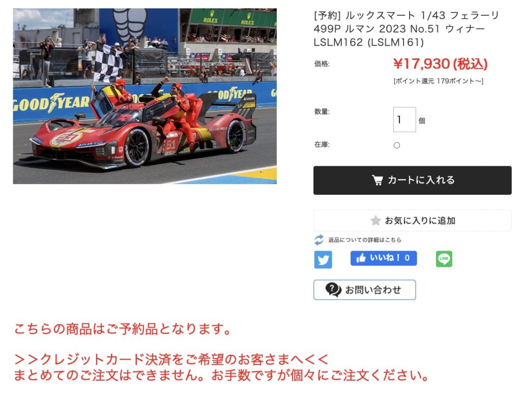 今年は50年ぶりにルマンに復帰し、見事優勝を勝ち取ったフェラーリ499Pの51号車。モデルカーは1/43スケールではルックスマートから発売いたします。