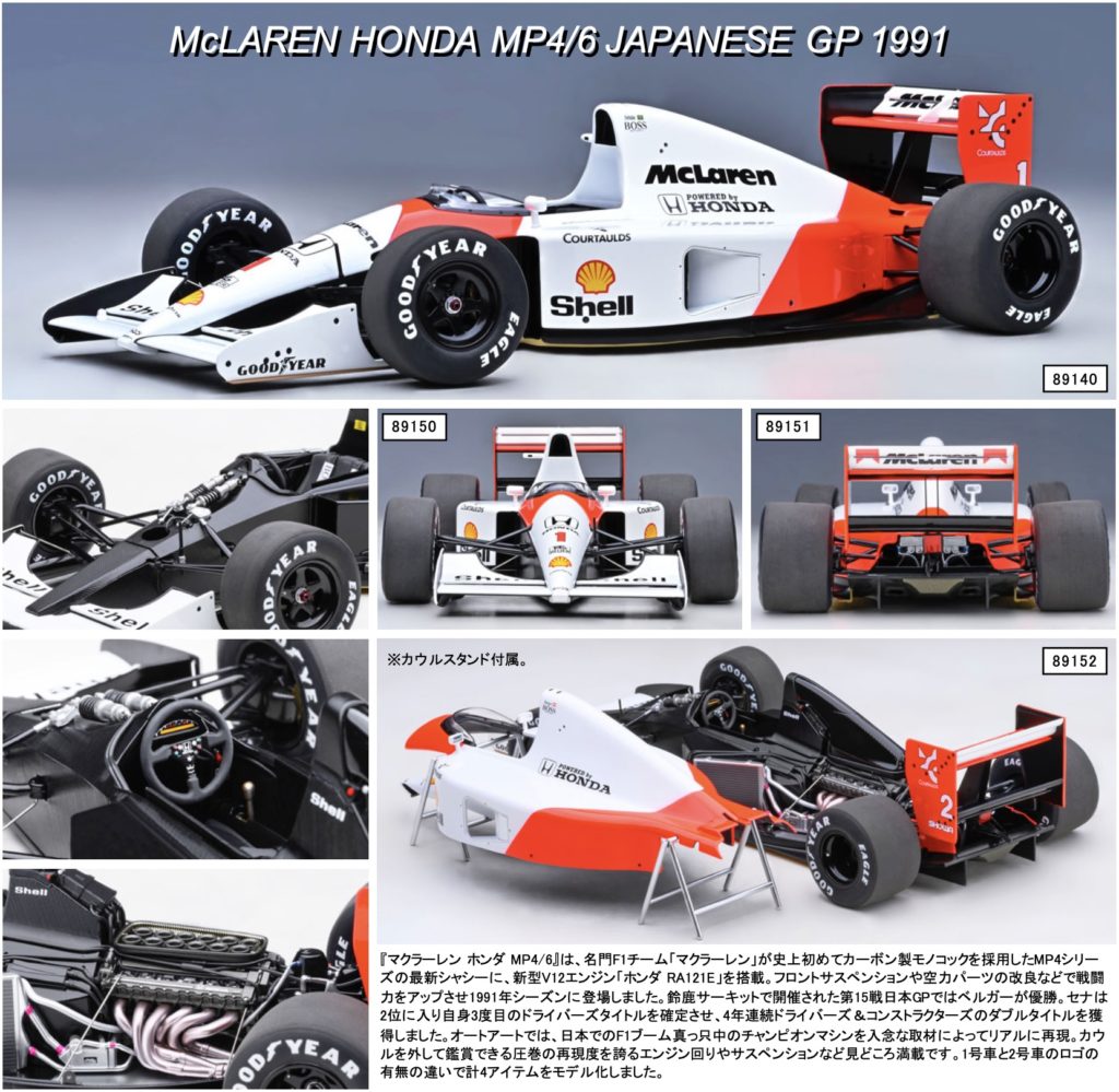 『マクラーレン ホンダ MP4/6』は、名門F1チーム「マクラーレン」が史上初めてカーボン製モノコックを採用したMP4シリーズの最新シャシーに、新型V12エンジン「ホンダ RA121E」を搭載。フロントサスペンションや空力パーツの改良などで戦闘力をアップさせ1991年シーズンに登場しました。
