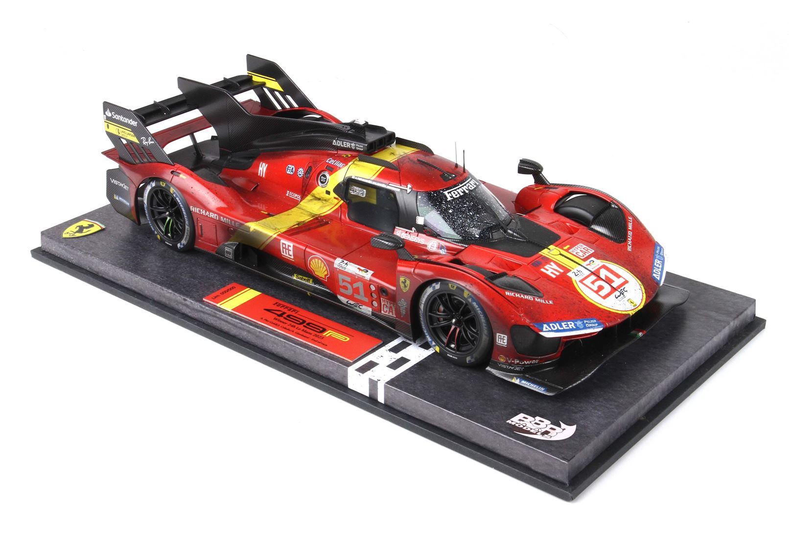 ウェザリングバージョンに関しては好みが別れる所だと思うのですが、実車のゴールシーンを再現するのであればウェザリグは必須です。BBRからウェザリング塗装バージョンが発売されるのは結構めずらしいですが、100周年記念大会でのフェラーリの久ぶりのルマン制覇にモデル化の要望も多かったのだと思います。