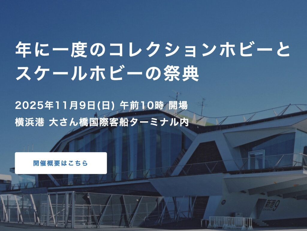 「横浜ホビーフォーラム」は、毎年秋に横浜・大さん橋ホールで開催される、模型・ホビー好きが集う日本最大級のイベントです。ミニカー・プラモデル・ガレージキットなど、車に特化したホビーが集結し、全国のモデラーさやメーカー、ディーラーが出店します。一般の入場は無料で、初心者の方や家族連れも楽しめるイベントです!