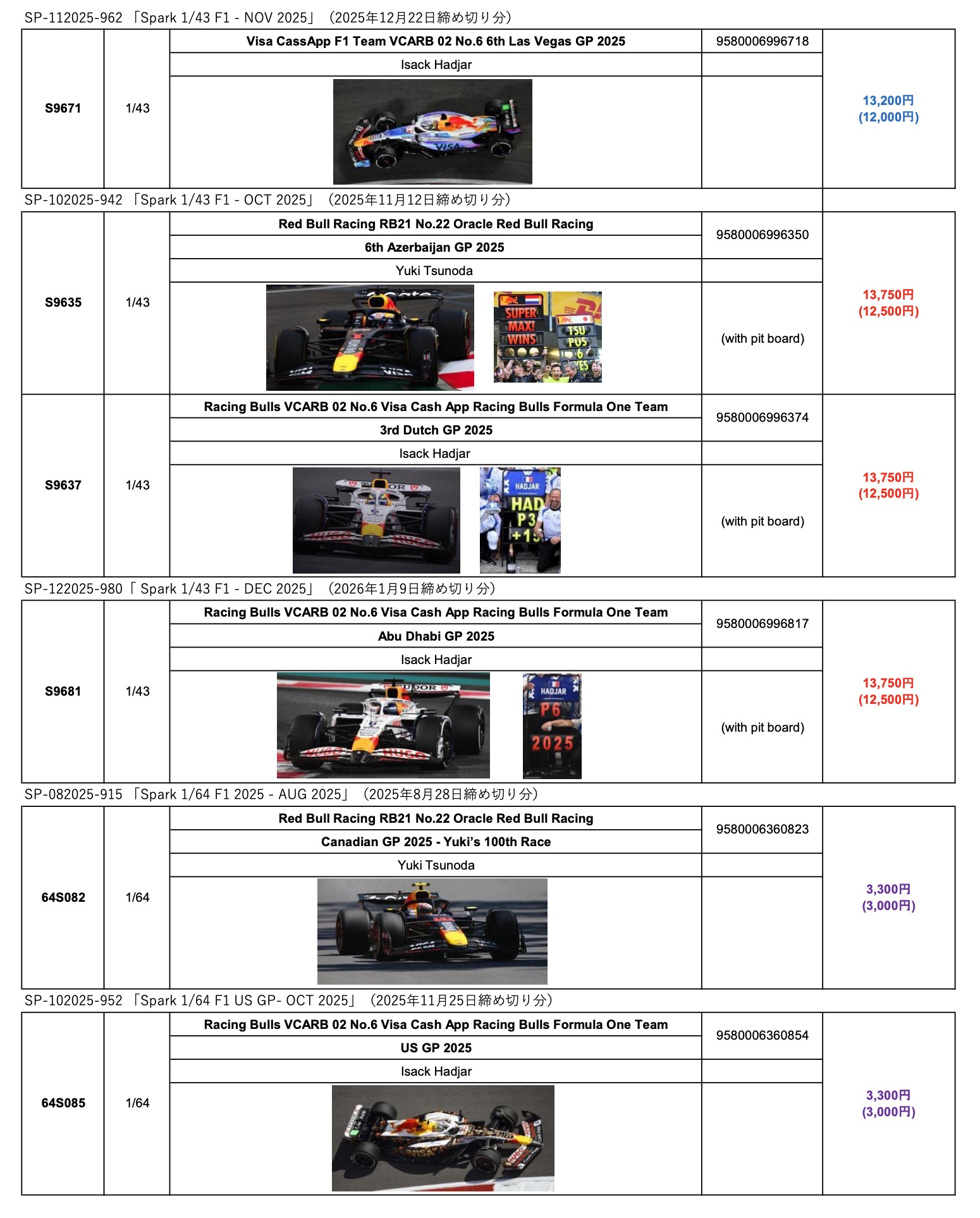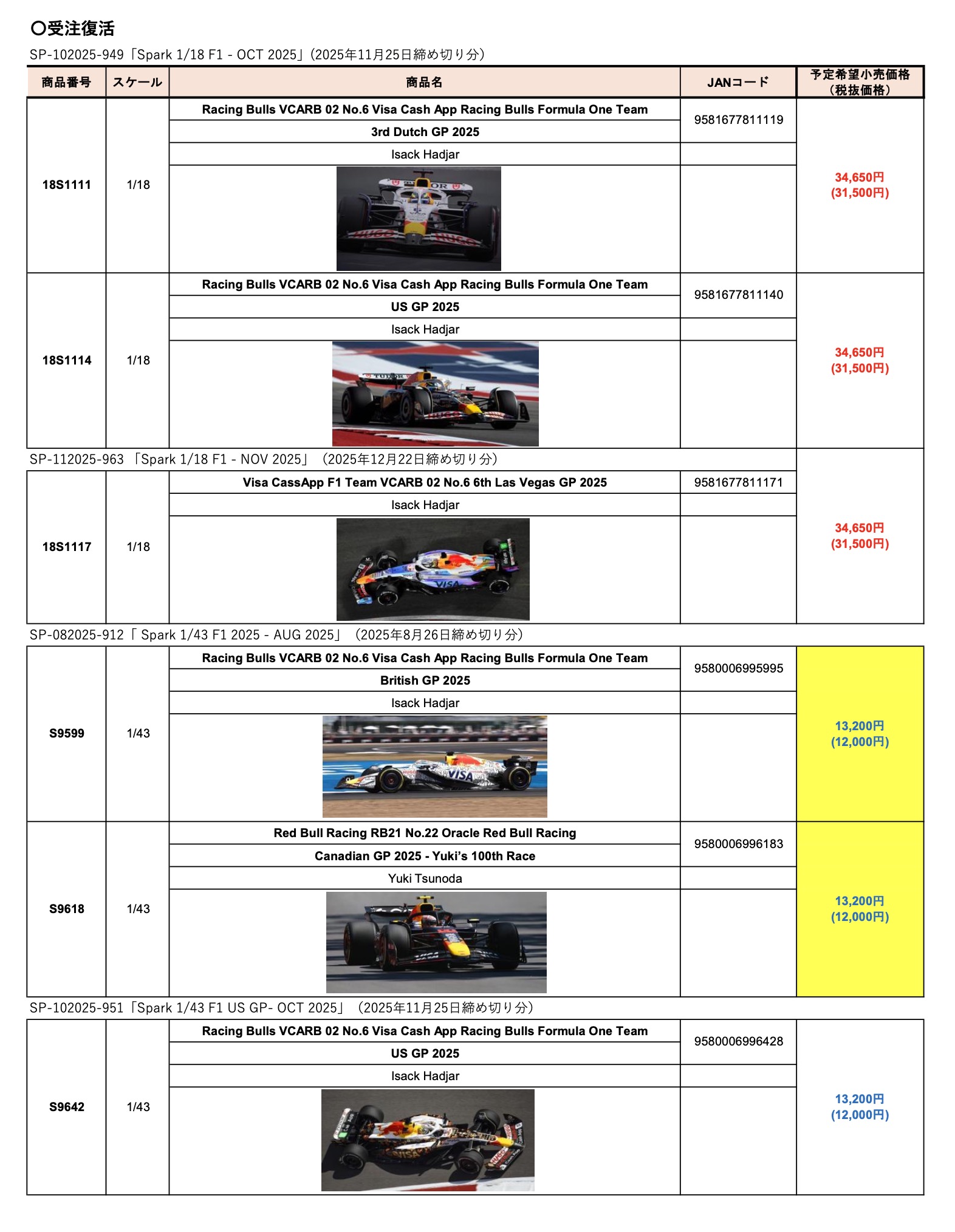 昨年12月に「発売中止」のご案内をさせていただきましたRed Bull / Racing Bulls 関連の一部新製品につきまして、メーカーより再発売決定の連絡がございました。