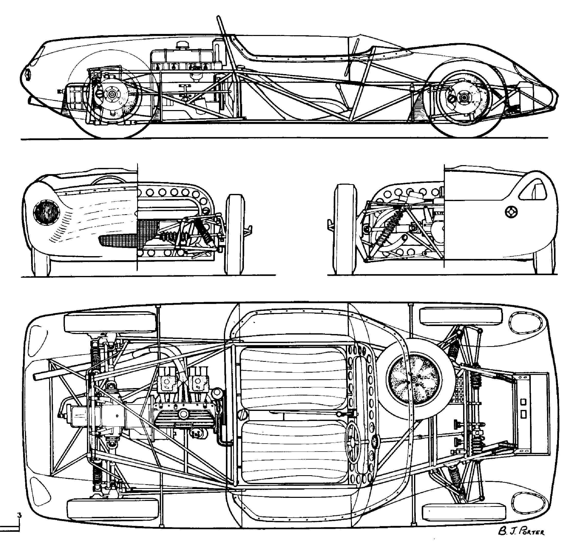 ロータス23の透視図をみるとこの車が当時F1からジュニアフォーミュラまで大活躍したロータス18/21のスペースフレームシャシーをを横に広げて2シーターにした構造なのがよくわかります。フォーミュラカーと成り立ちが同じシンプルで無駄なものが一切ない軽量な作りこそが俊敏で圧倒的な速さの秘密なのでした。